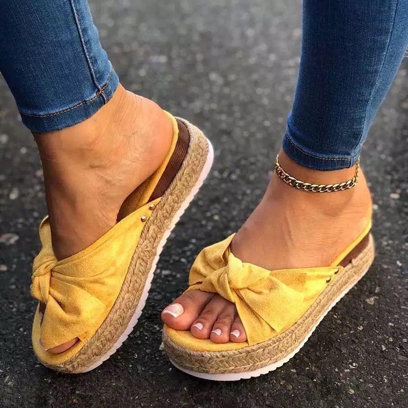 Women Chunky Hemp Rope Bow Slides Platform Sandals