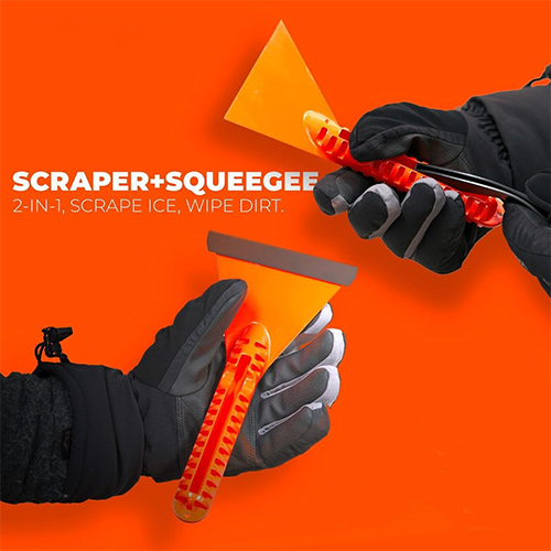 The compact size with angled handle ergonomics and flared, extra-depth scoop make it ideal for clearing snow in a pinch. Our custom squeegee blades can be used to clear glass from dirt or bugs.